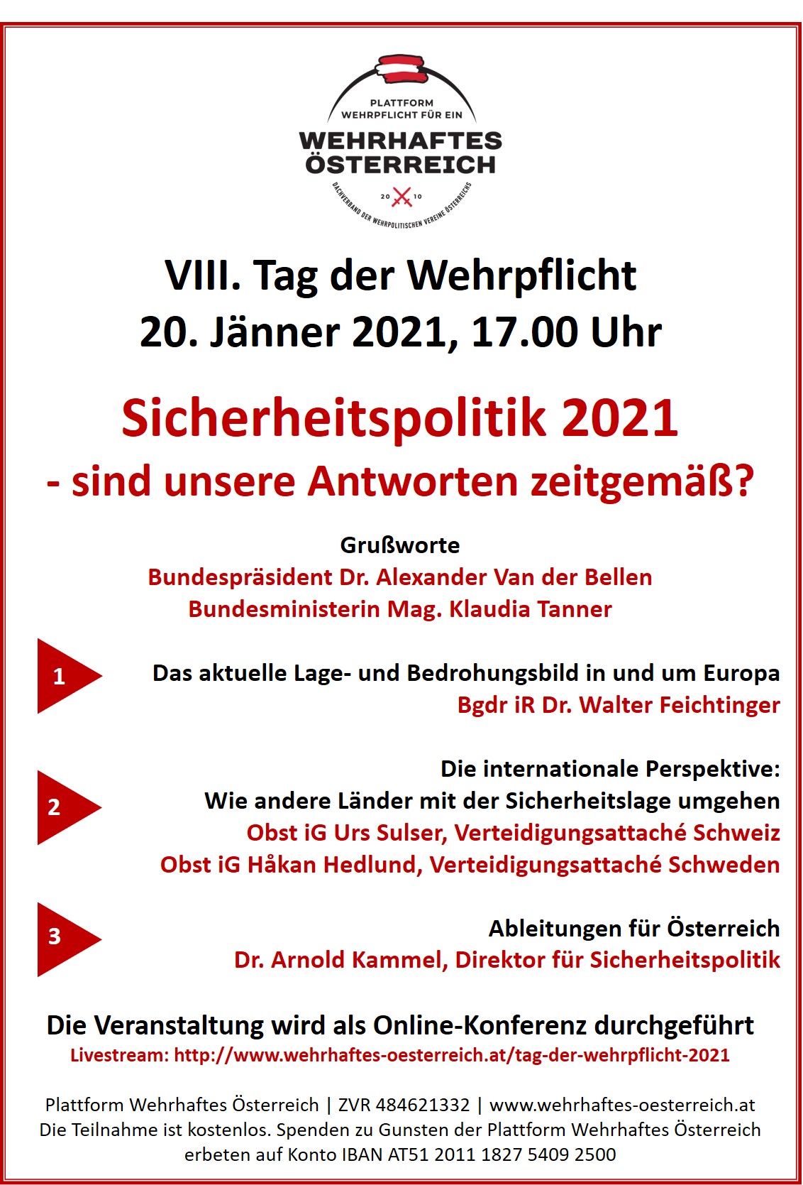 Die Österreichische Offiziersgesellschaft als Mitbegründerin der Plattform Wehrhaftes Österreich lädt zum kommenden Tag der Wehrpflicht am 20. Jänner 2021 um 17:00 Uhr ein!